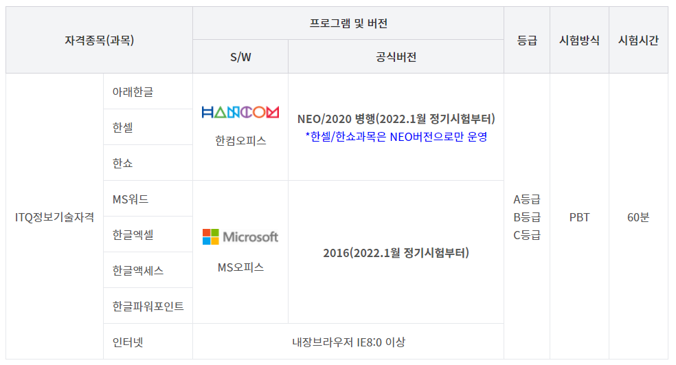 (자격증에는 한글엑셀(한셀) "한글파워포인트(한쇼) 로 표기되며 최상위등급이 기재됨)