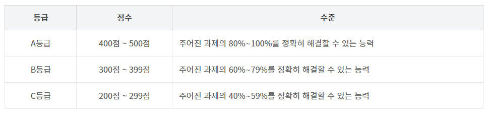 ITQ시험은 500점 만점을 기준으로 A등급부터 C등급까지 등급별 자격을 부여하며, 낮은 등급을 받은 응시자가 차기 시험에 다시 응시 하여 높은 등급을 받으면 등급을 업그레이드 해주는 방법으로 평가를 합니다.